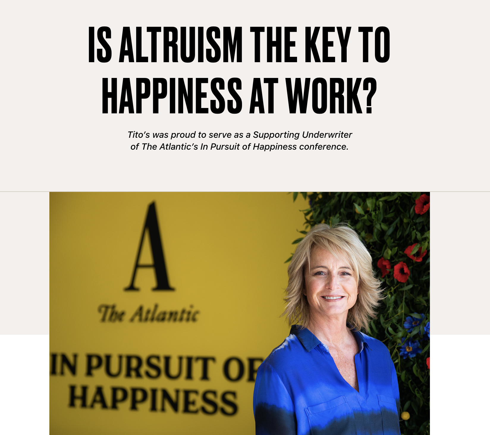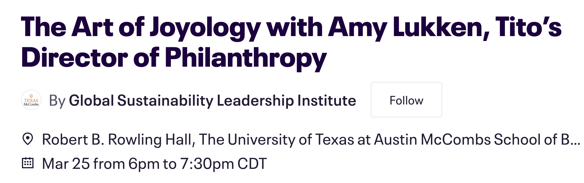 Amy Lukken, Chief Joyologist and head of the philanthropy team for Tito’s, “oversees the giving strategy and works to fulfill the mission to ‘turn spirits into love and goodness’ by fostering relationships with local charities.”